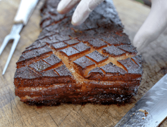 Almost as long as the loin, the belly provides rich and fatty meat. A boned and rolled Belly joint, roasted slowly over several hours until the fat has melted away, lubricating the meat in the process and producing the best crackling, is delightful. At the shoulder end of the belly sit the ribs. The rib sheets can be cooked as whole racks or cut between the bones into individual meaty spare ribs, which are full of flavour, good value for money and always popular for barbecues. Cured pork belly makes streaky bacon, smoked or unsmoked or Virginia cured and the Italian version, Pancetta.